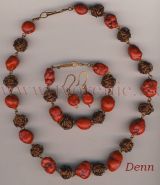 Omlouvám se všem, ale zde budu psát svou rodnou řečí, snad to nebude až zase takový problém a všichni pochopí . Francouzské "mušky" Na výrobu kuliček z drátu byl použitý měděný drát o síle 0,5 mm, ketlovací jehly a zapínání jsou z drátu 0,7 mm. V tomto šperku byly použity velké červené kamínky nepravého minerálu. Kytička Základ kytičky tvoří nerezový drát o síle 0,8 mm, na výplet byl použitý nerezový drát o průměru 0,2 mm a průsvitný rokajl 0,2 mm. Kytička je pověšená na koženém řemínku. Síť na obruči Základem tohoto šperku je platinová obruč o průměru 15 cm, síť korálků z 2 mm rokajlu byla vytvořená za pomoci nerezového drátu o síle 0,2 mm technikou šité krajky. Veselé kroužky Na kroužky o průměru 10 mm v barvě gun metal je navlečený rokajl 0,4 mm. Kroužky jsou pospojované a zavěšené na voskové sňůře 1 mm černé barvy, zapíná se černou karabinou. Dutinka Dutinka vyrobená z nerezového drátu o síle 0,2 mm a 0,4 mm rokajlu, která je navlečená na obruči o průměru 15 cm platinové barvy. Kopretinková sada Sada vyrobená z měděného drátu o síle 0,6 mm. Náhrdelník je doplněný o kůži a měděné komponenty - kalota, karabina. Náramek tvoří kopretinka a háčkovaný řetízek z drátu. Modrá souprava Jednoduchý náhrdelník z modrých kamínků nepravého minerálu a nerezového drátu o síle 0,2 mm, vytvořeno technikou dutinky. Náramek tvoří dutinka ze stejných korálků a nerezového drátu.